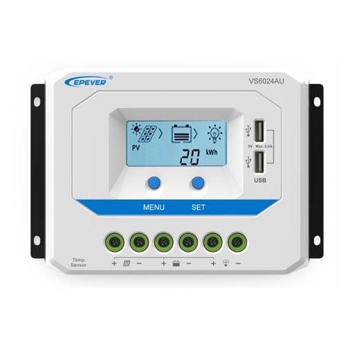 Надежный и практичный контроллер заряда Epsolar VS6048AU 60А 12/48В применяется для заряда свинцово-кислотных аккумуляторов напряжением 12В или 24В. Используется с солнечными панелями суммарной мощностью 720-1440 Вт. Дополнительно оснащен двумя портами USB для подзарядки различных мобильных устройств.